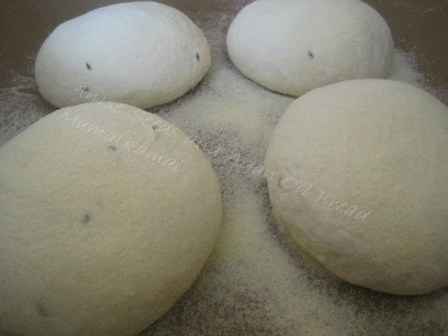4-Roll out each ball into a thin circle about 0.3 cm, dusting generously the top of bread with fine semolina and some anise seeds. / Etaler progressivement les boules en cercles sur une épaisseur de 0.3 cm environ, en saupoudrant généreusement la surface du pain de la semoule fine et quelques graines d'anis.